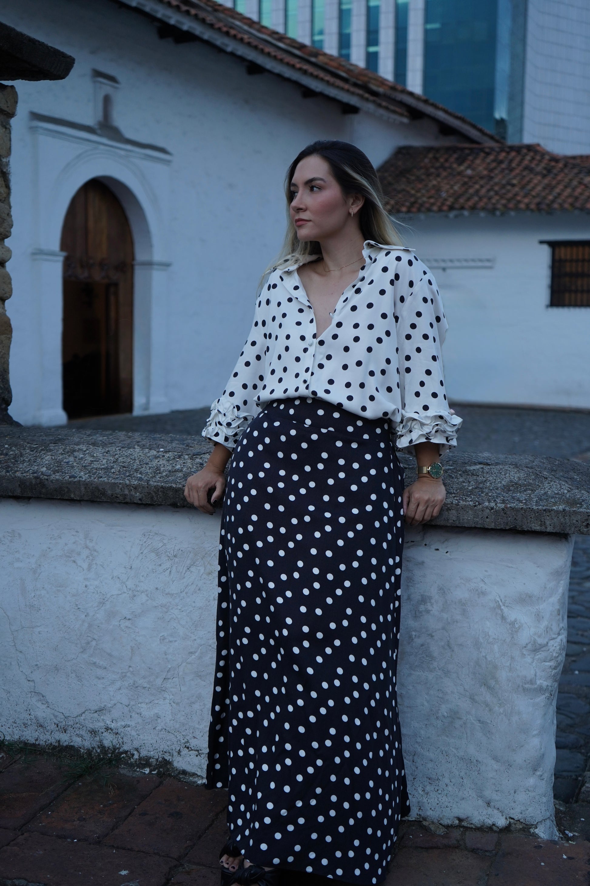 Una falda midi que juega con el ritmo de los puntos blancos y una textura fluida. Una prenda versátil que funciona igual de bien en looks casuales o más cuidados.