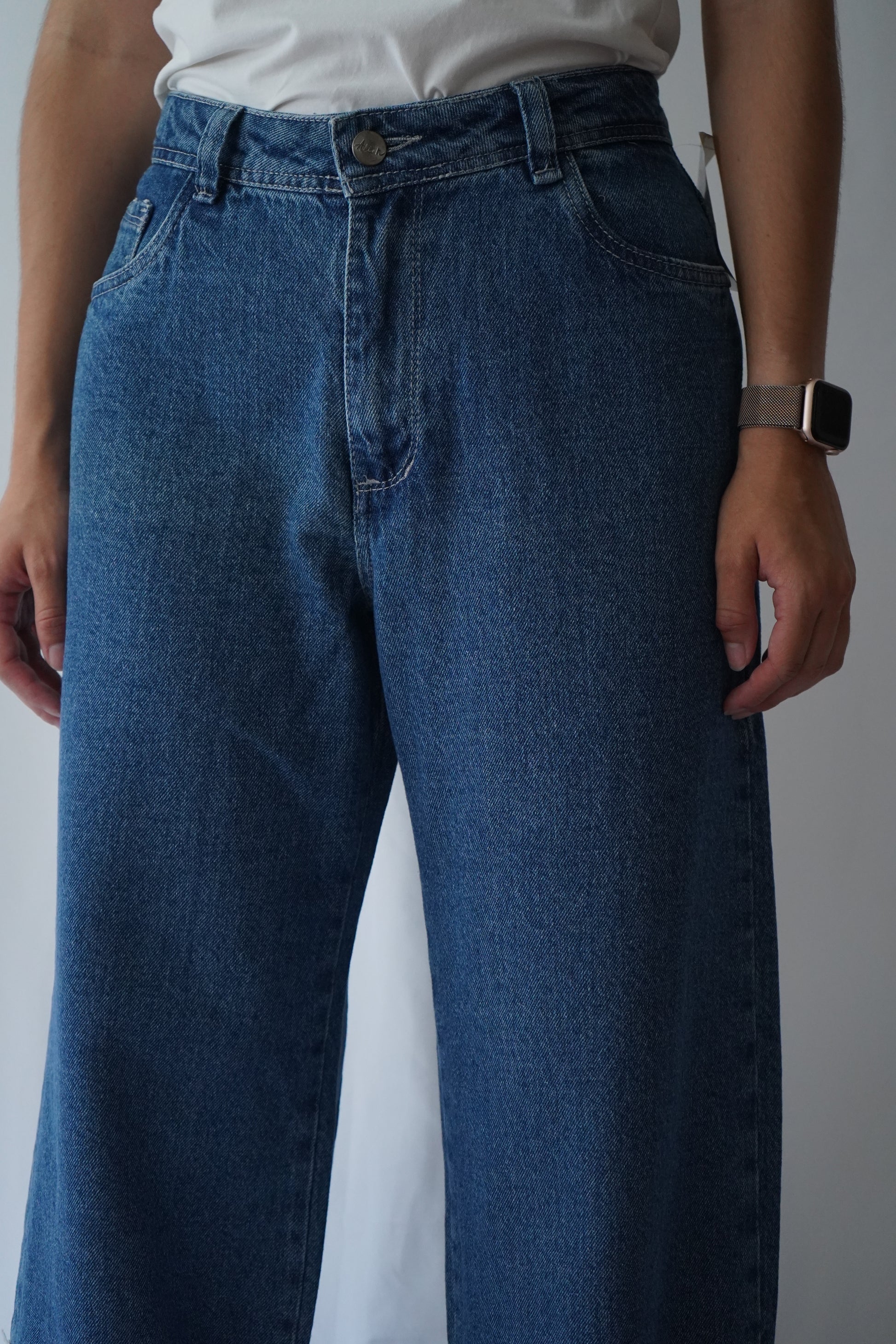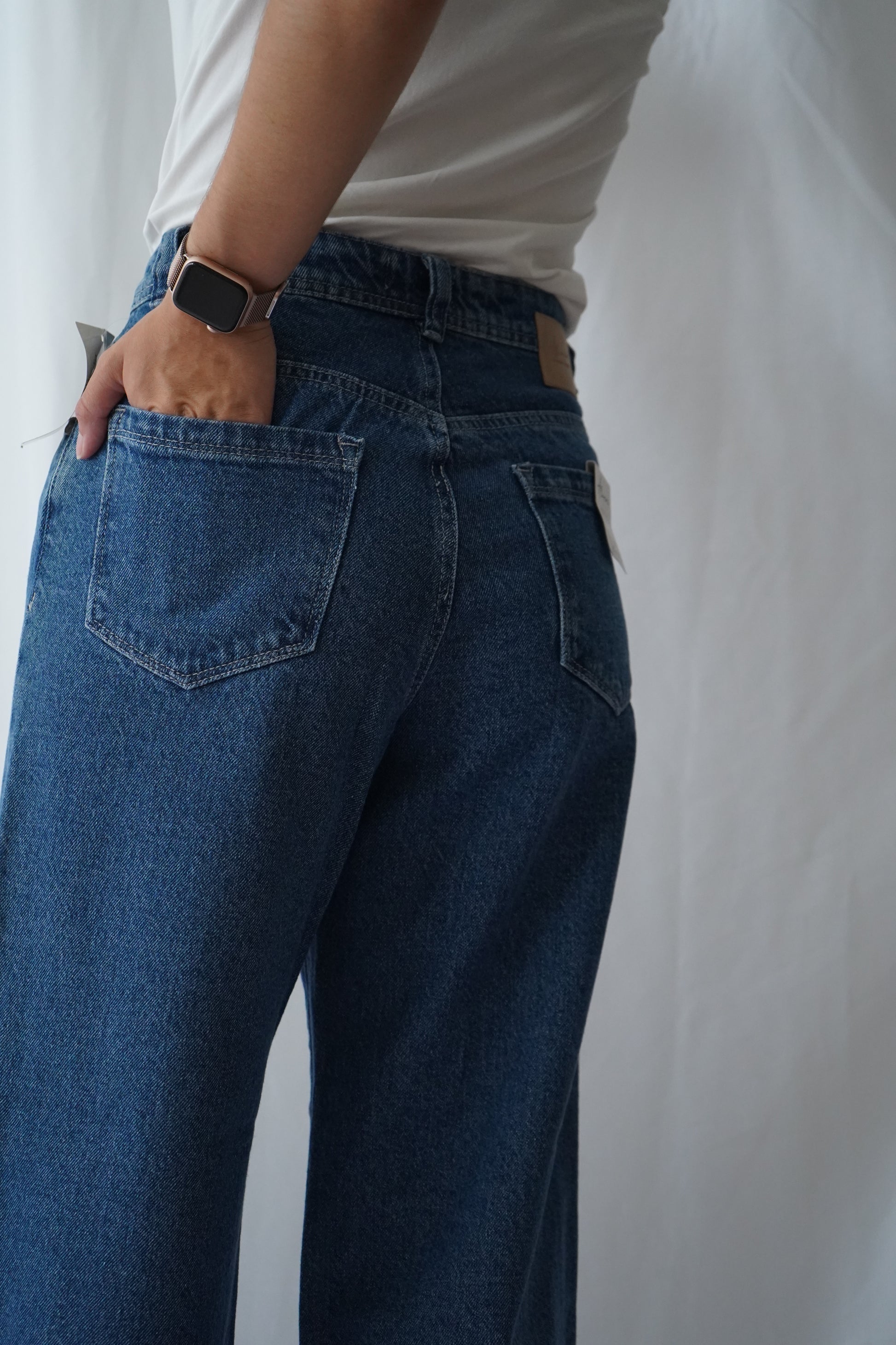Jean oscuro con doblez, bota recta. Disponible Talla 10