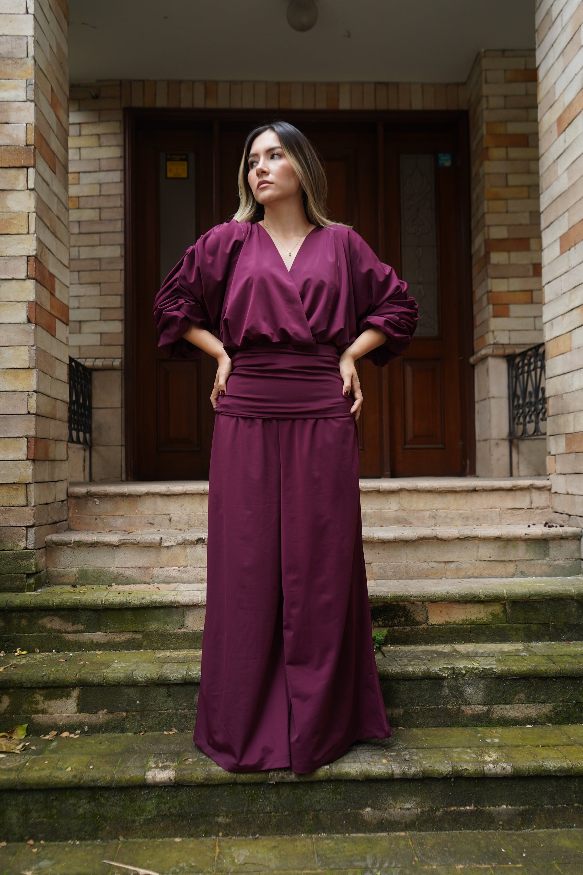 Cintura al cuerpo, caída ancha y suelta. Una pieza en licra que funciona tanto como pantalón como en enterizo completo.